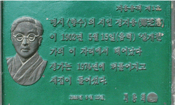 충북 옥천읍에서 북동쪽으로 10리쯤 떨어진 곳에 곧게 뻗어 나간 산줄기, 일자산이 있다. 이산의 계곡에서 흘러내린 물이 모여 실개천을 이루고 있는데, 이 개천을 건너는 다리가 청석교이다. 정지용은 1902년 6월 20일, 이 다리 바로 옆에 있는 촌가에서 한약상을 경영하던 연일 정 씨 태국을 아버지로 하고, 하동 정 씨 미하를 어머니로 하여 4대 독자로 태어났다.