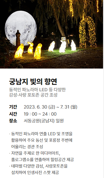 | 6.30(금) ~ 7.31(월) | 19:30 ~ 24:00 | 궁남지 빛의 향연 | 서동공원 |