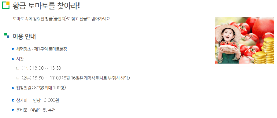 ▶내용 : 토마토 수확이라는 직접 체험을 통해 색다른 경험을 제공